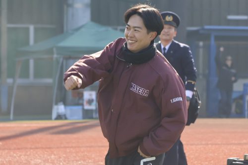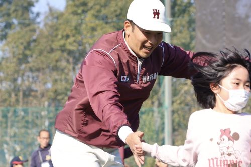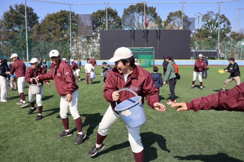 「どか点ゲーム」とは、ティー台に置かれたボールを打った後、守備側が打球を戻す前に、走者が通過した塁の数がそのまま得点になるルールのゲームです。安全面に配慮しながら、寺尾拳聖(新4年・外・人間・佐久長聖)や、千葉海翔(新4年・マネ・教育・盛岡一)も子供たちと一緒にボールを追いかけ、大声で一緒に楽しんでいる姿が印象的でした。