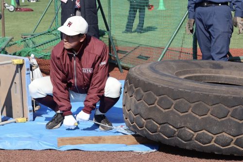 救助コーナーでは、ネットや木材を使用して倒壊現場を再現し、実際にジャッキを用いながら救助の手順を教わりました。日常生活の中でジャッキを扱う機会はほとんどないため、ジャッキでタイヤを持ち上げ救助活動に取り組む部員を見るのは、とても新鮮でした。